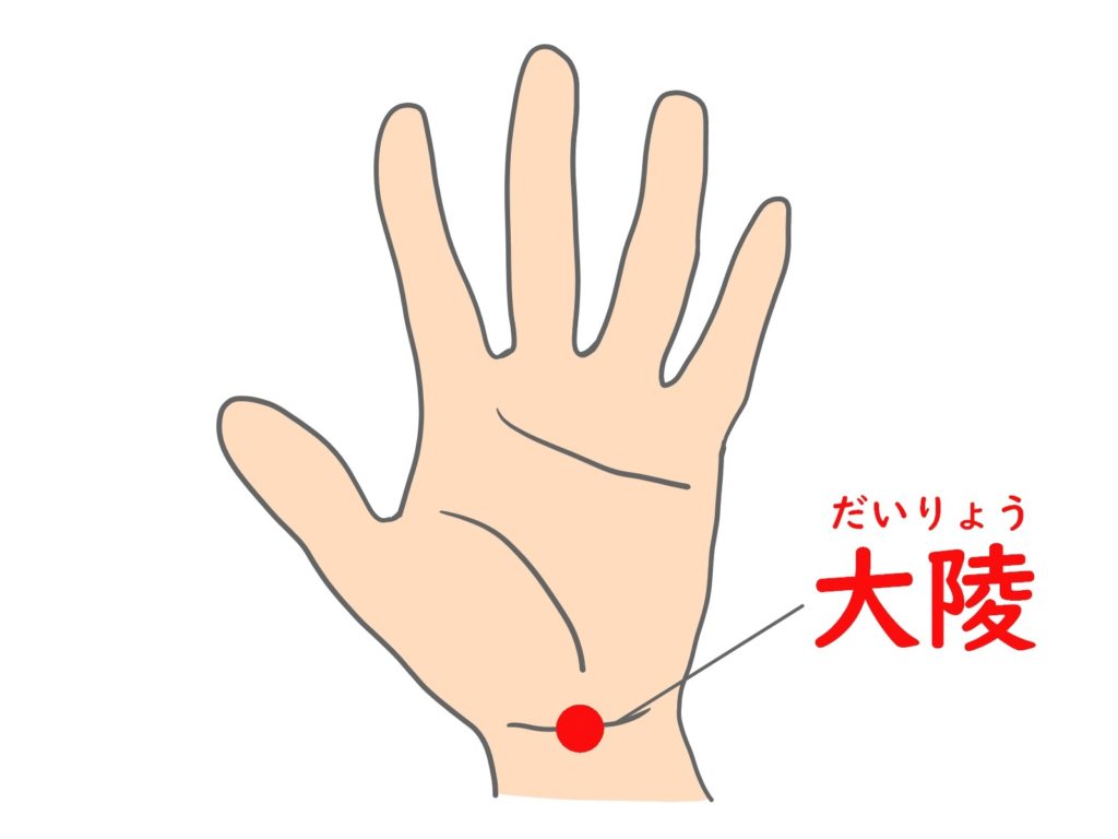 大陵(だいりょう)は、手首を内側に曲げたときに出来るシワの真ん中あたり、腱と腱の間にあるツボです。