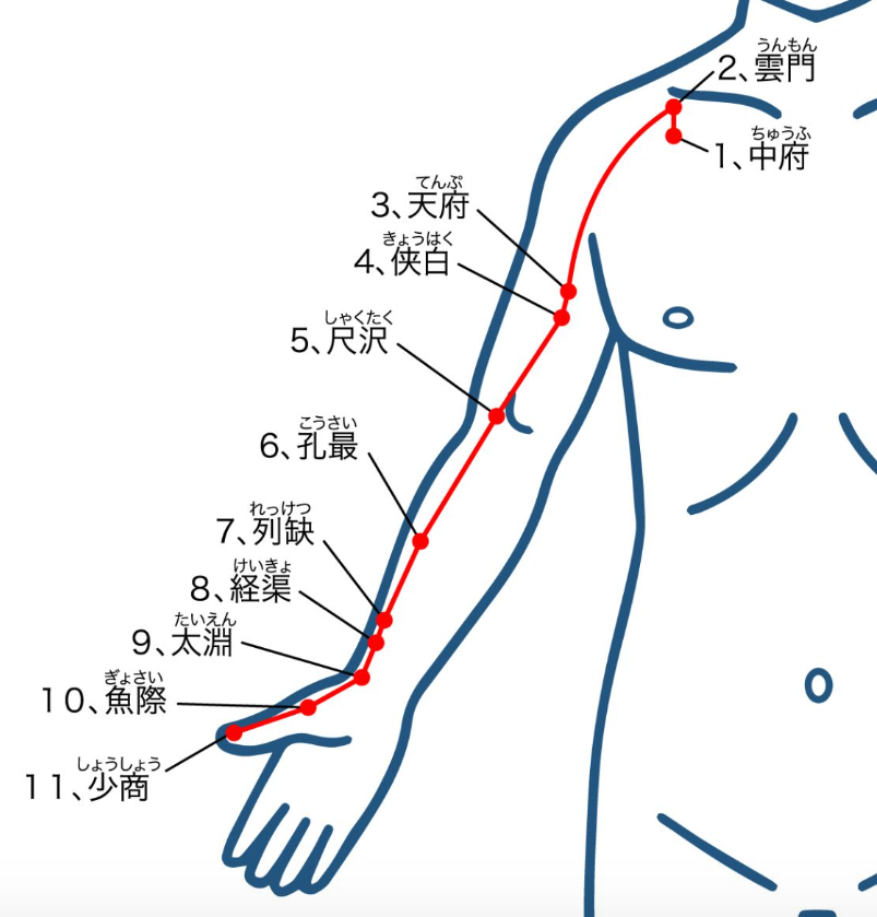 【経絡のひとつ(手の太陰肺経)とその上にある経穴】